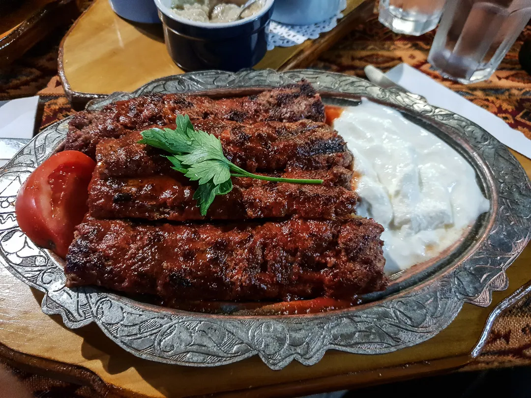 Adana Kebab – Spiced minced meat grilled on skewers.